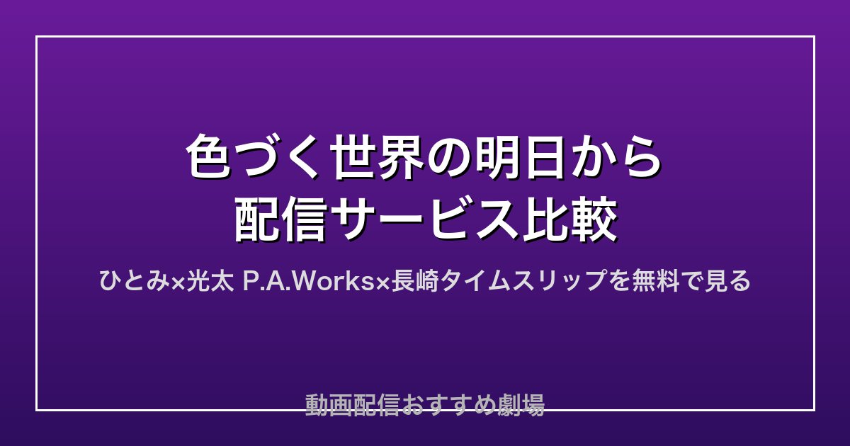 「色づく世界の明日から」はDMM TV・U-NEXT・Amazon Prime Video・ABEMAプレミアムで見放題中だよ!P.A.Worksが手がけた長崎を舞台にした美麗アニメで、色が見えない少女が60年前の過去にタイムスリップする感動の物語なんだ。
